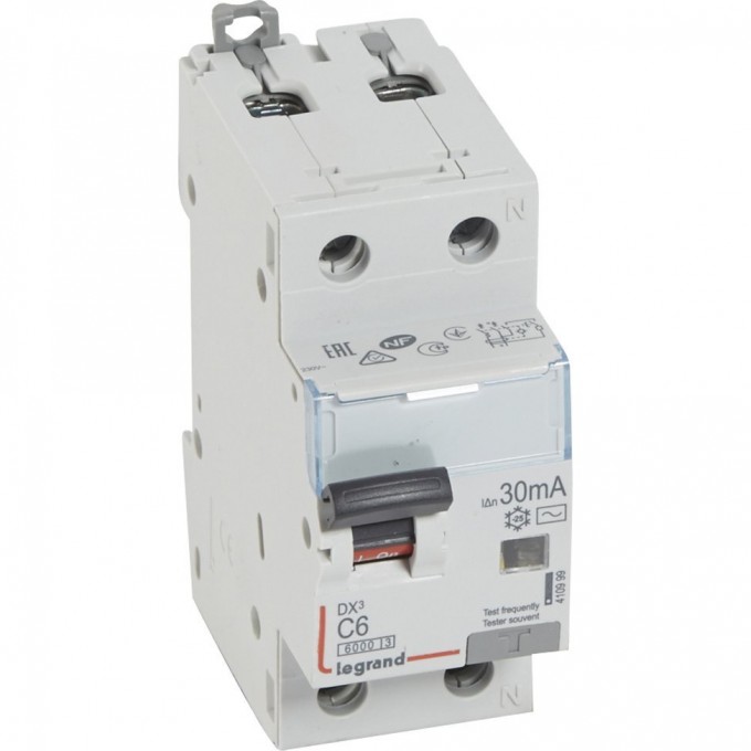 Автоматический выключатель дифференциального тока LEGRAND DX³ 6000 10 кА тип характеристики С 1П+Н 230 В 6 А тип AС 30 мА 2 модуля белый 410999